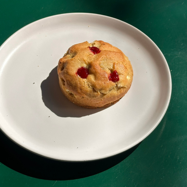 Cookie con masa de limón y chocolate blanco, con mermelada de frambuesa.