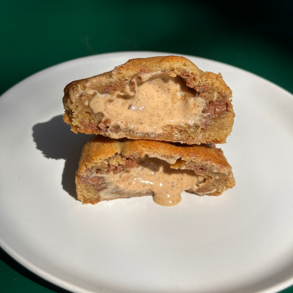 Cookie con avellanas troceadas, chocolate con leche, rellena de crema de avellana y chocolate blanco.