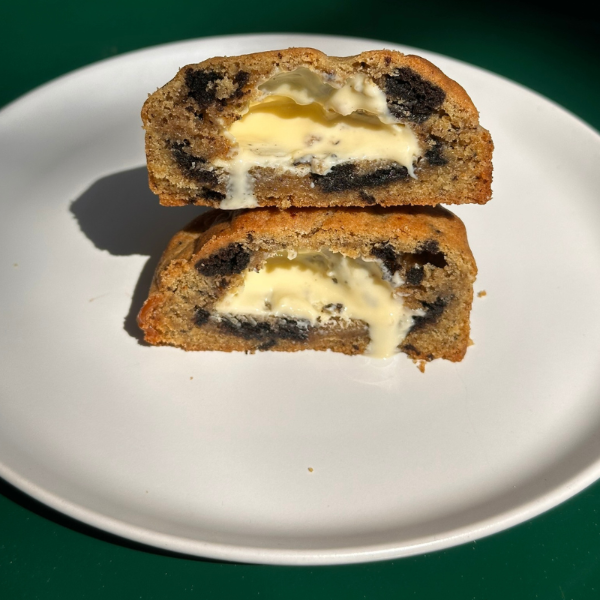 Masa de vainilla y oreo, rellena de chocolate cobertura blanco.